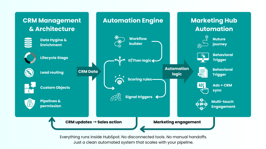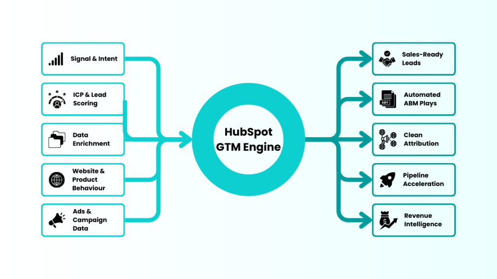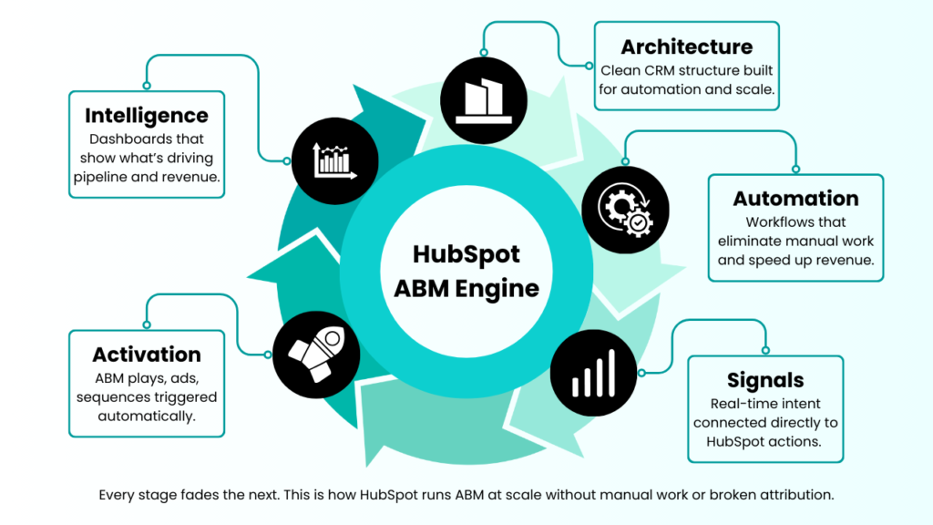 When architected correctly, HubSpot becomes the central system that connects signals, automation, ABM, sales, and revenue intelligence—running your entire go-to-market motion automatically.